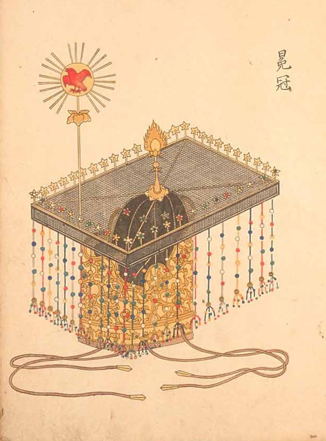 34 – 冕冠 – benkan – square-topped ceremonial crown with jeweled tassels